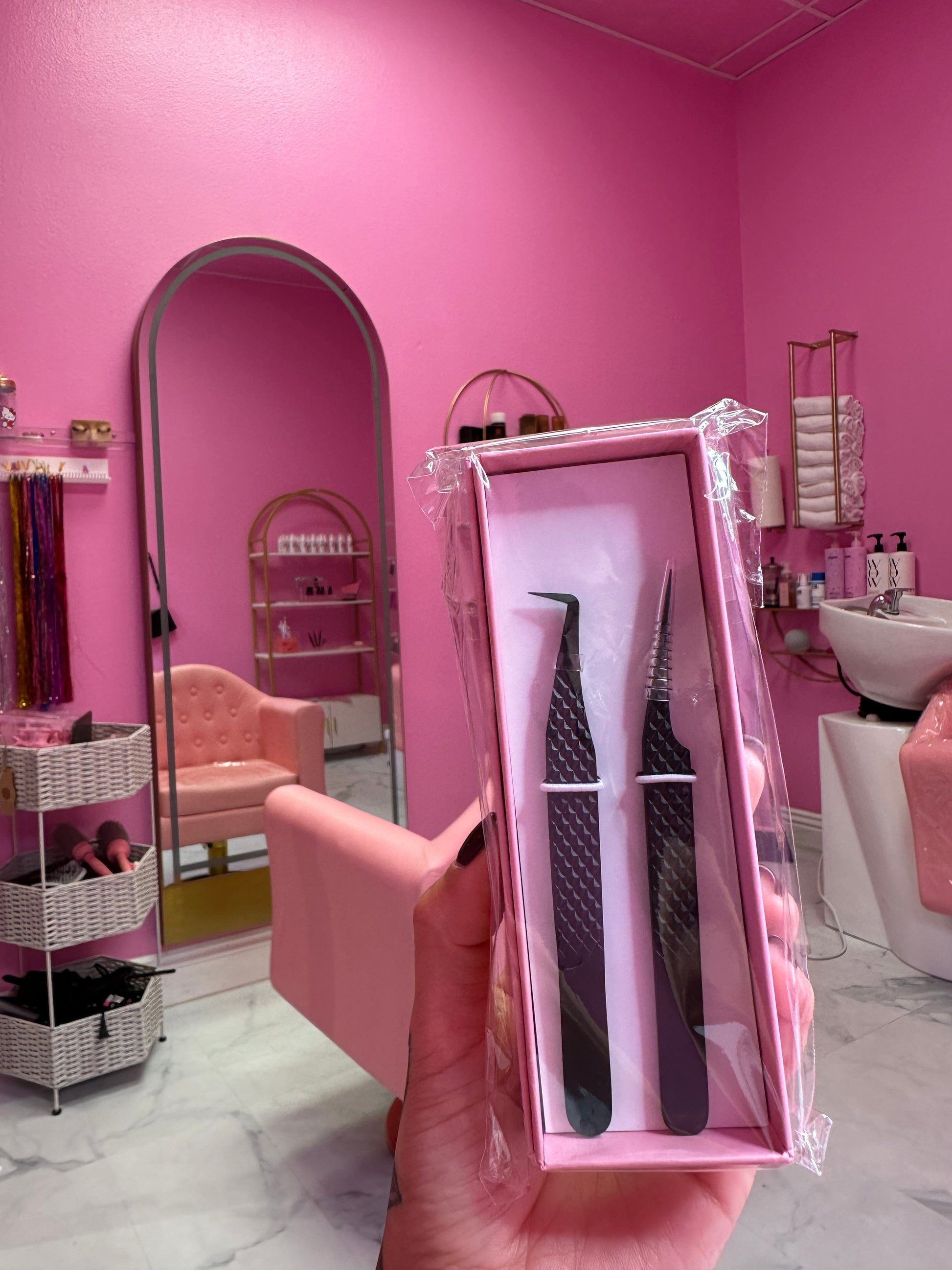 Straight isolation tweezer and fiber grip volume tweezer in matte black.